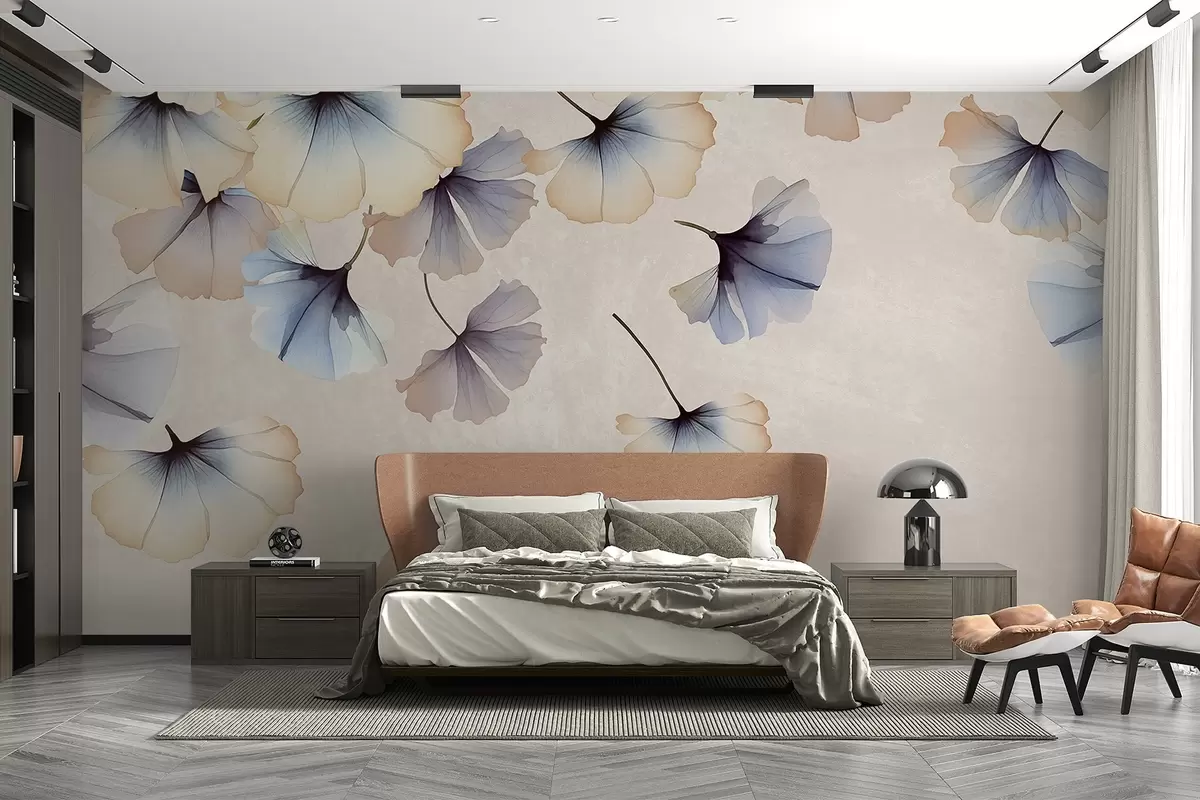 Fototapety Pastelovo sfarbené modré a béžové listy ginka s jemnými okvetnými lístkami vznášajúcimi sa vo vzduchu na texturálnom pozadí Nr. w08578