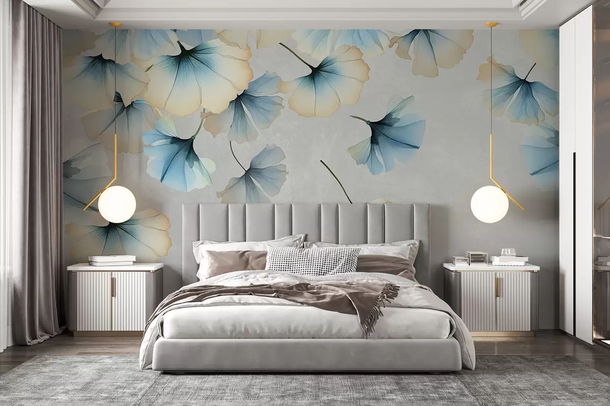 Fototapety Pastelovo sfarbené modré a žlté listy ginka s jemnými okvetnými lístkami vznášajúcimi sa vo vzduchu na texturálnom pozadí Nr. w08578v1