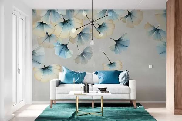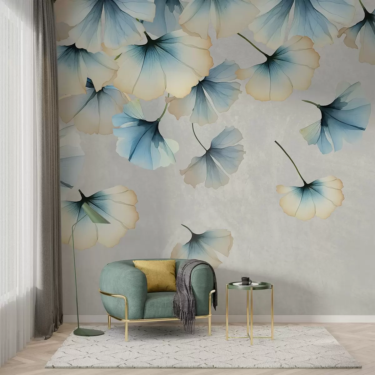 Fototapety Pastelovo sfarbené modré a žlté listy ginka s jemnými okvetnými lístkami vznášajúcimi sa vo vzduchu na texturálnom pozadí Nr. w08578v1