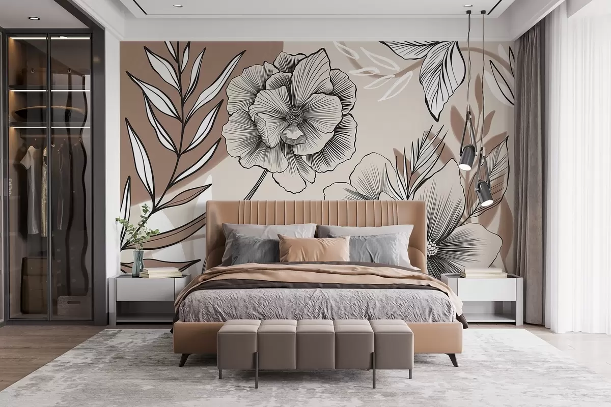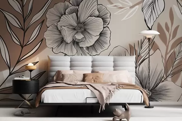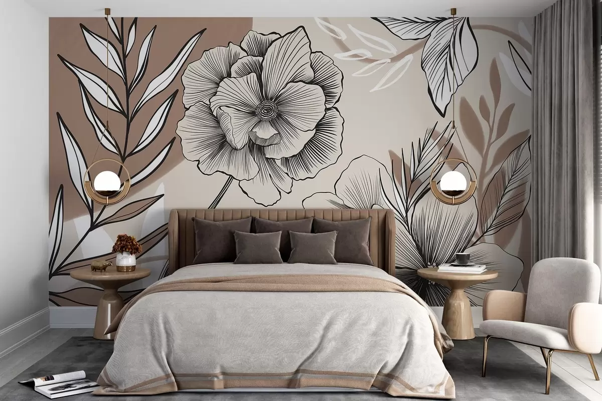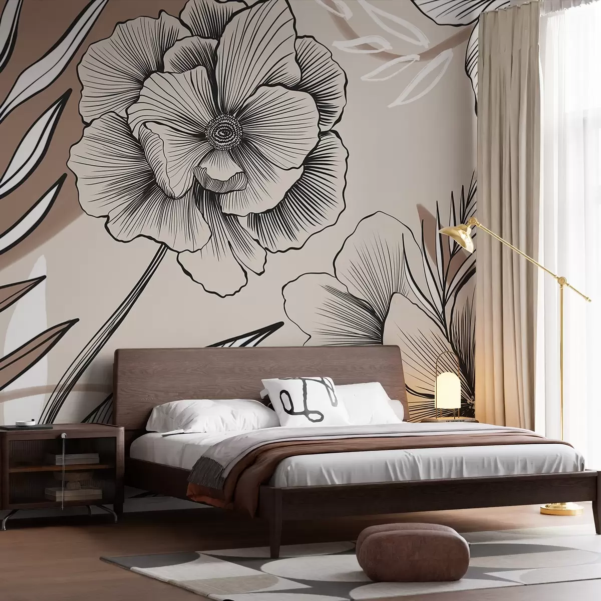 Fototapety Veľké čiernobiele grafické kvety s detailnými listami na béžovom abstraktnom pozadí Nr. w08580