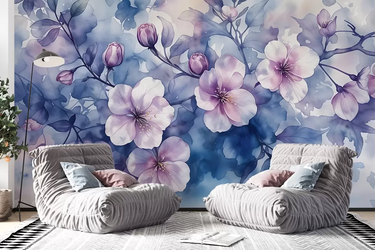 Fototapety Jemná akvarelová imitácia ružových a fialových kvetov s jemnými, rozmazanými okvetnými lístkami na modrom pozadí s postriekaním Nr. w08582