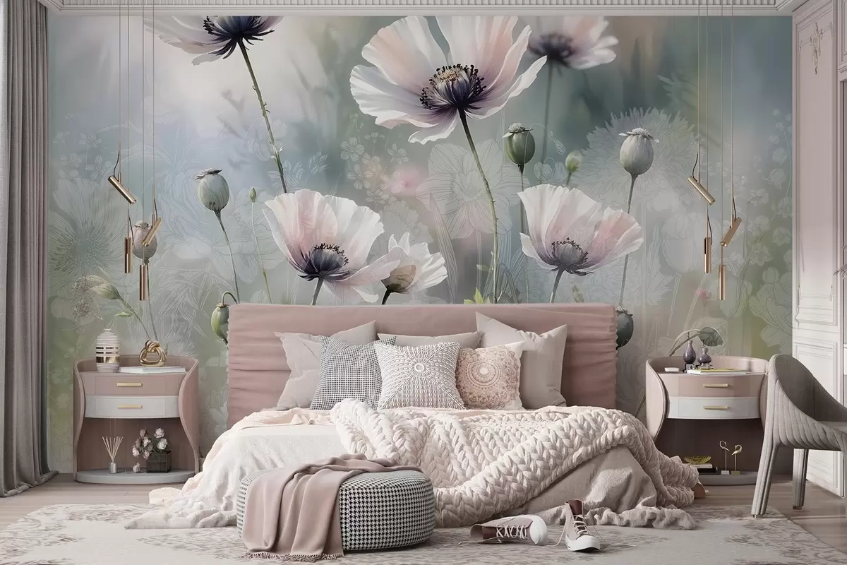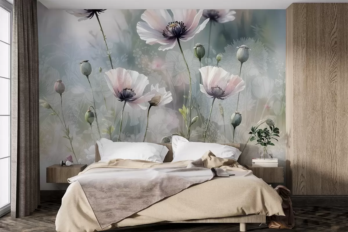 Fototapety Jemné ružové a fialové maky so zelenými stonkami a púčikmi na jemnom, rozmazanom textúrovanom pozadí Nr. w08585