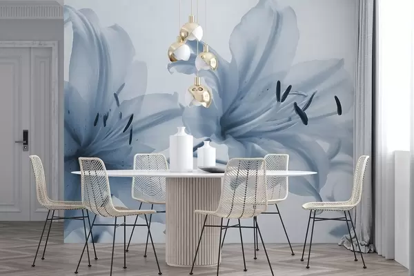 Fototapety Mäkké zaostrenie priblíženia modrých minimalistických kvetov ľalií na svetlom pozadí Nr. w08586