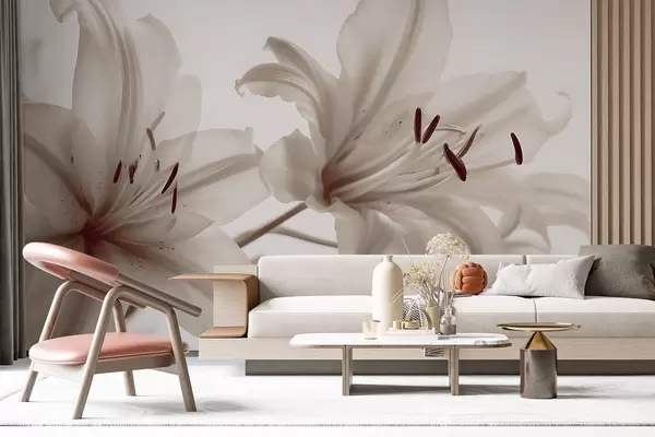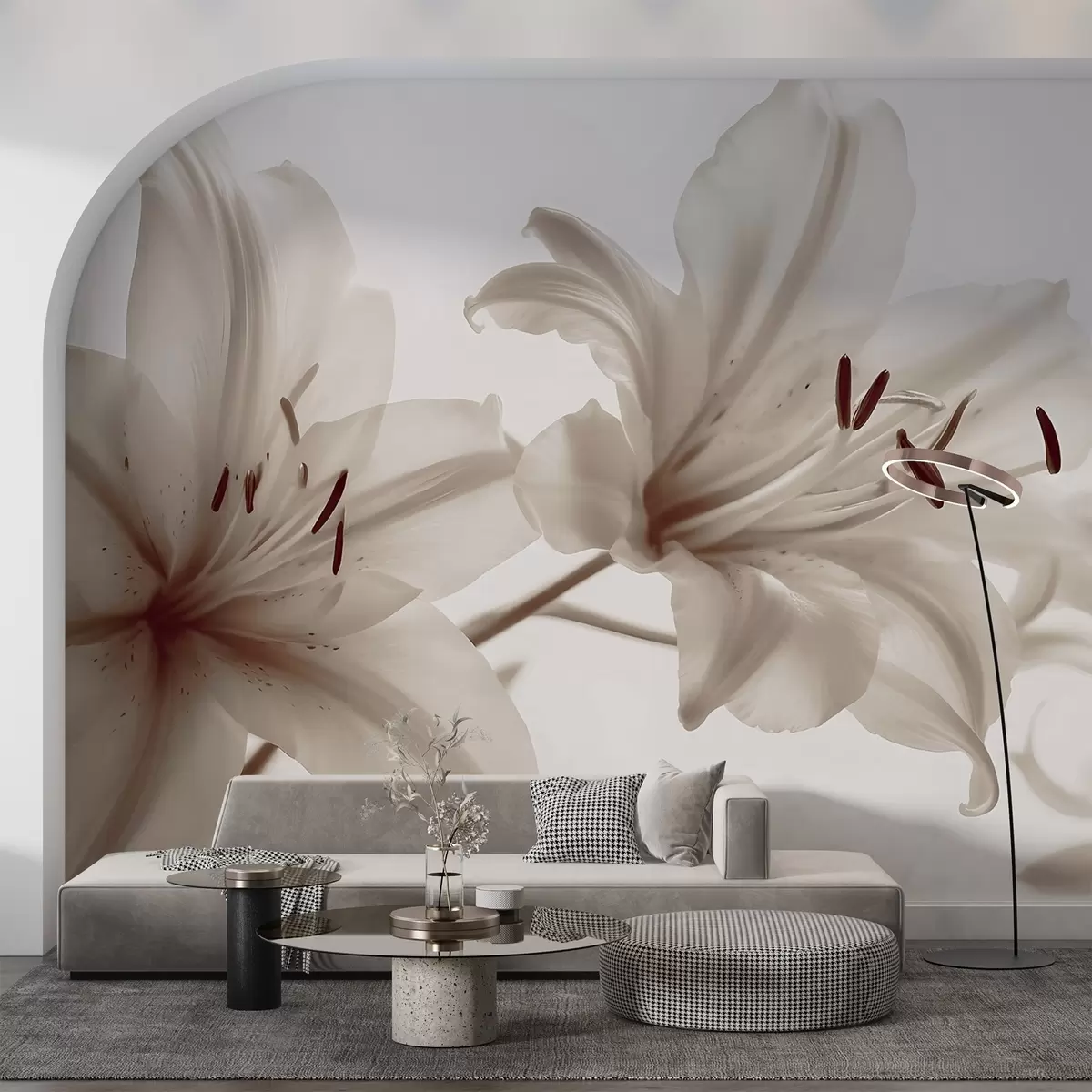 Fototapety Mäkké zaostrenie priblíženia béžových minimalistických kvetov ľalií na svetlom pozadí Nr. w08586v1