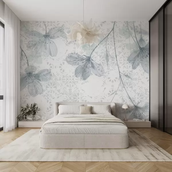 Fototapety Jemné modré a biele kvety s dlhými stonkami a okvetnými lístkami na jemnom, rozmazanom texturálnom pozadí Nr. w08588