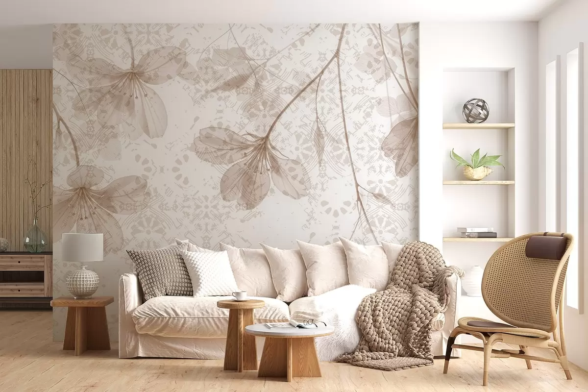 Fototapety Jemné béžové a biele kvety s dlhými stonkami a okvetnými lístkami na jemnom, rozmazanom textúrovanom pozadí Nr. w08588v1