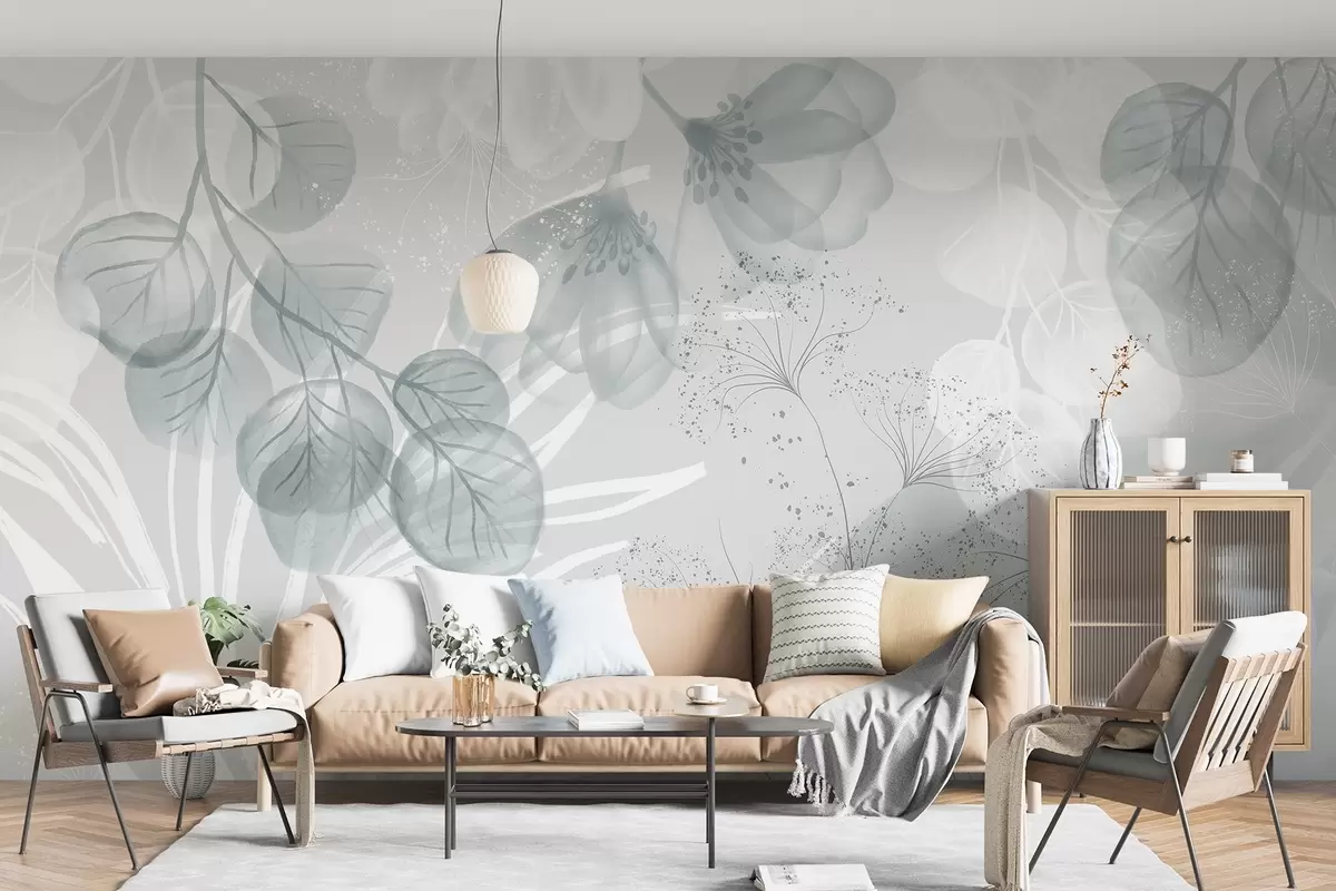 Fototapety Kvetinové prvky eukaliptu v modrých a bielych odtieňoch s prekrývajúcimi sa listami a okvetnými lístkami v minimalistickom štýle Nr. w08599