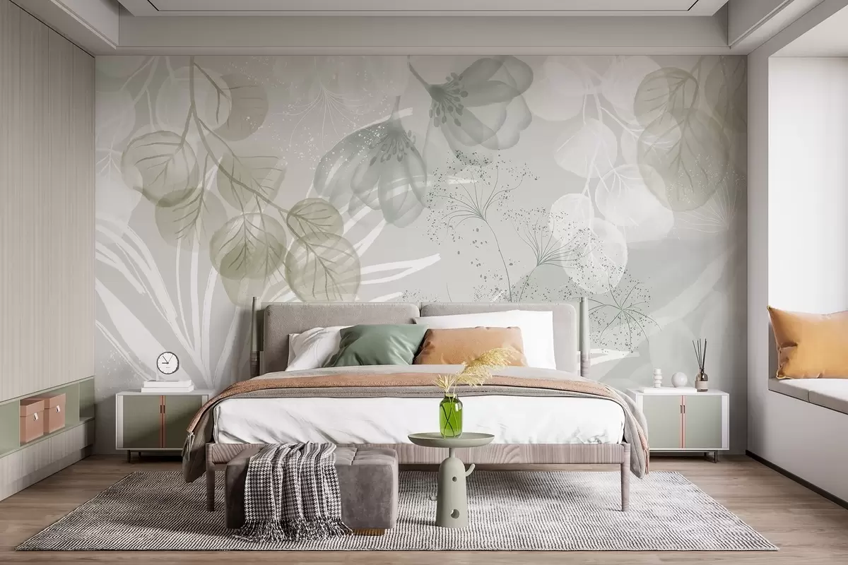 Fototapety Kvetinové prvky eukaliptu v zelených a bielych odtieňoch s prekrývajúcimi sa listami a okvetnými lístkami v minimalistickom štýle Nr. w08599v1