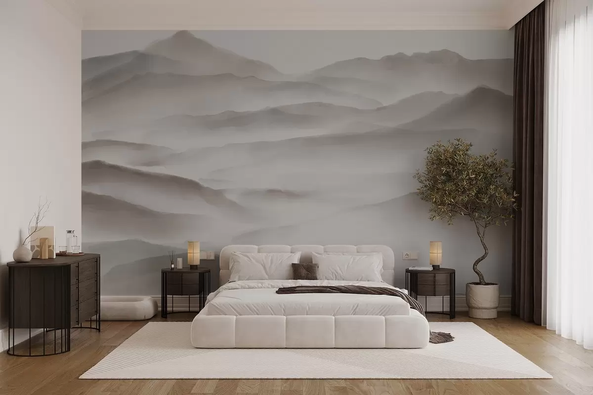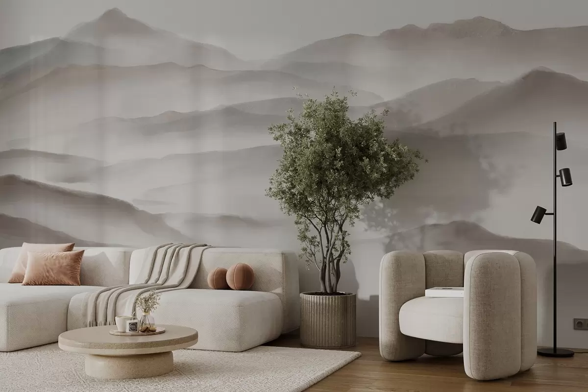 Fototapety Minimalistická horská krajina s kopcami a hmlou, ktorá vytvára pokojnú a atmosférickú tlač Nr. w08602