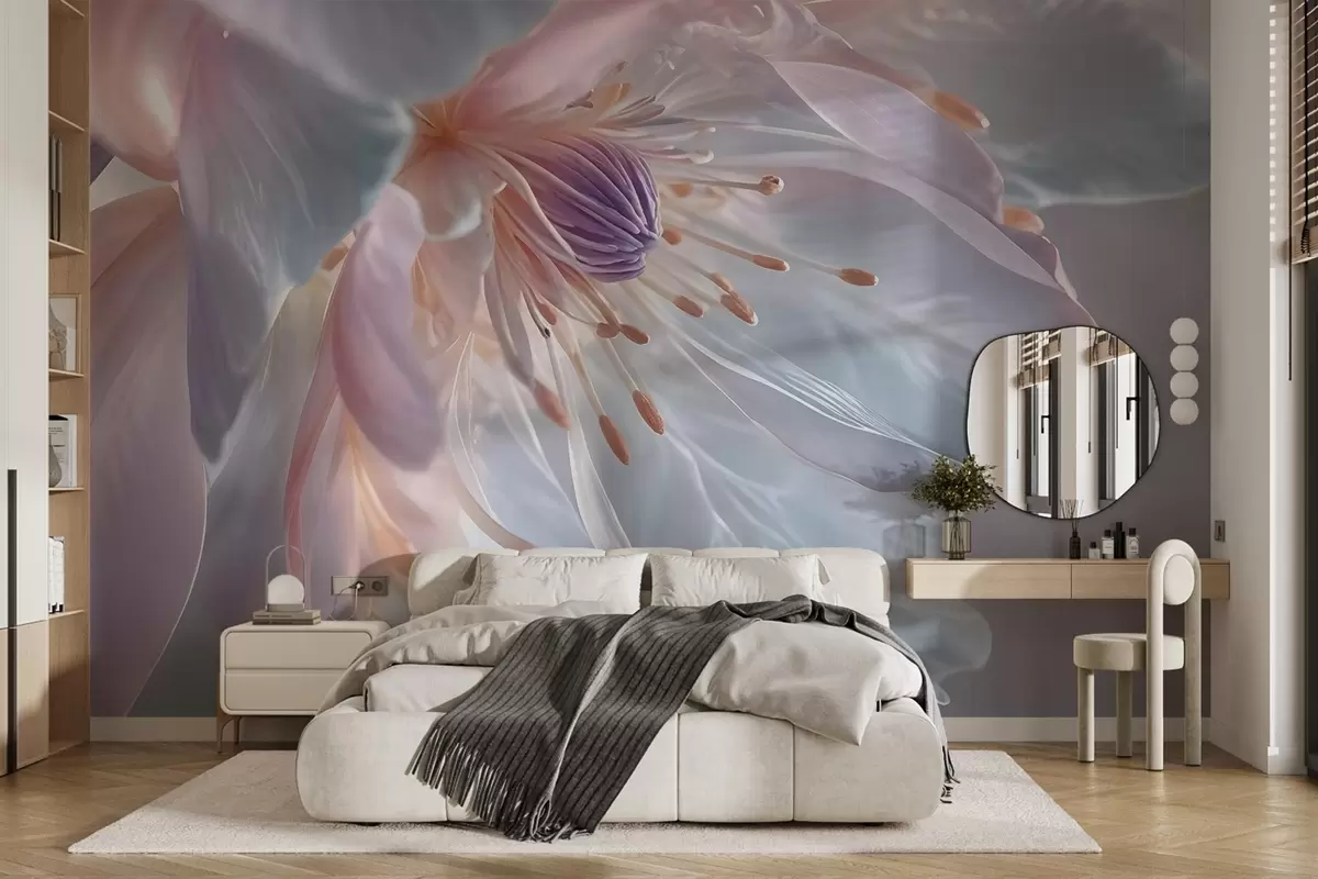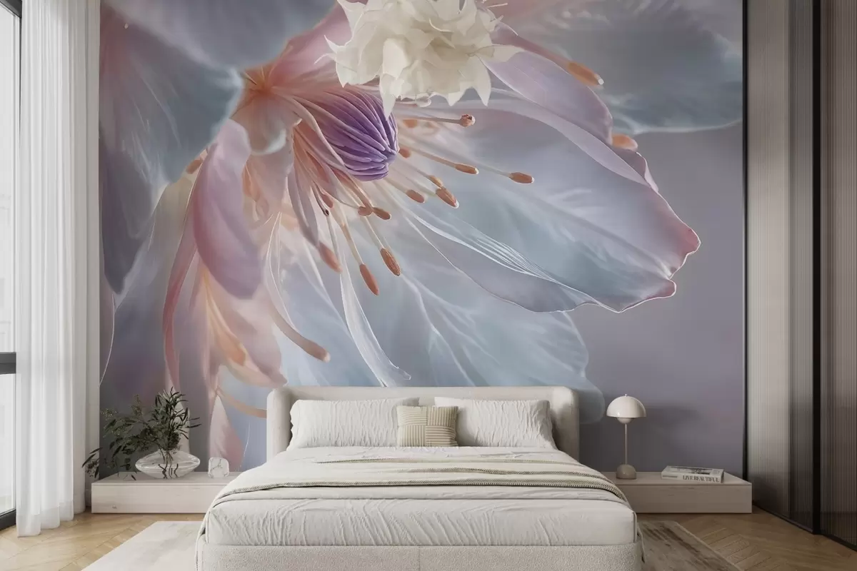 Fototapety Detailný záber na jemný, pastelovo sfarbený kvet s jemnými, priesvitnými okvetnými lístkami a žiarivým stredom Nr. w08605