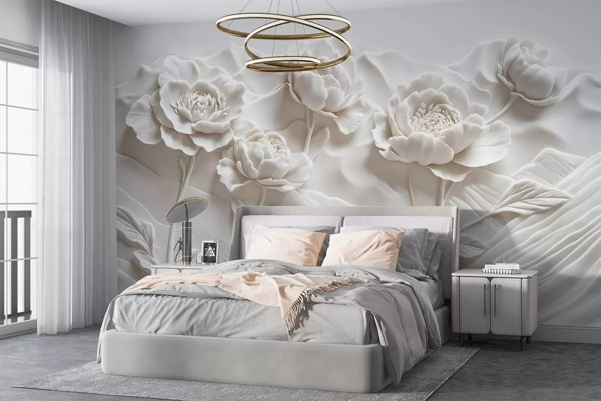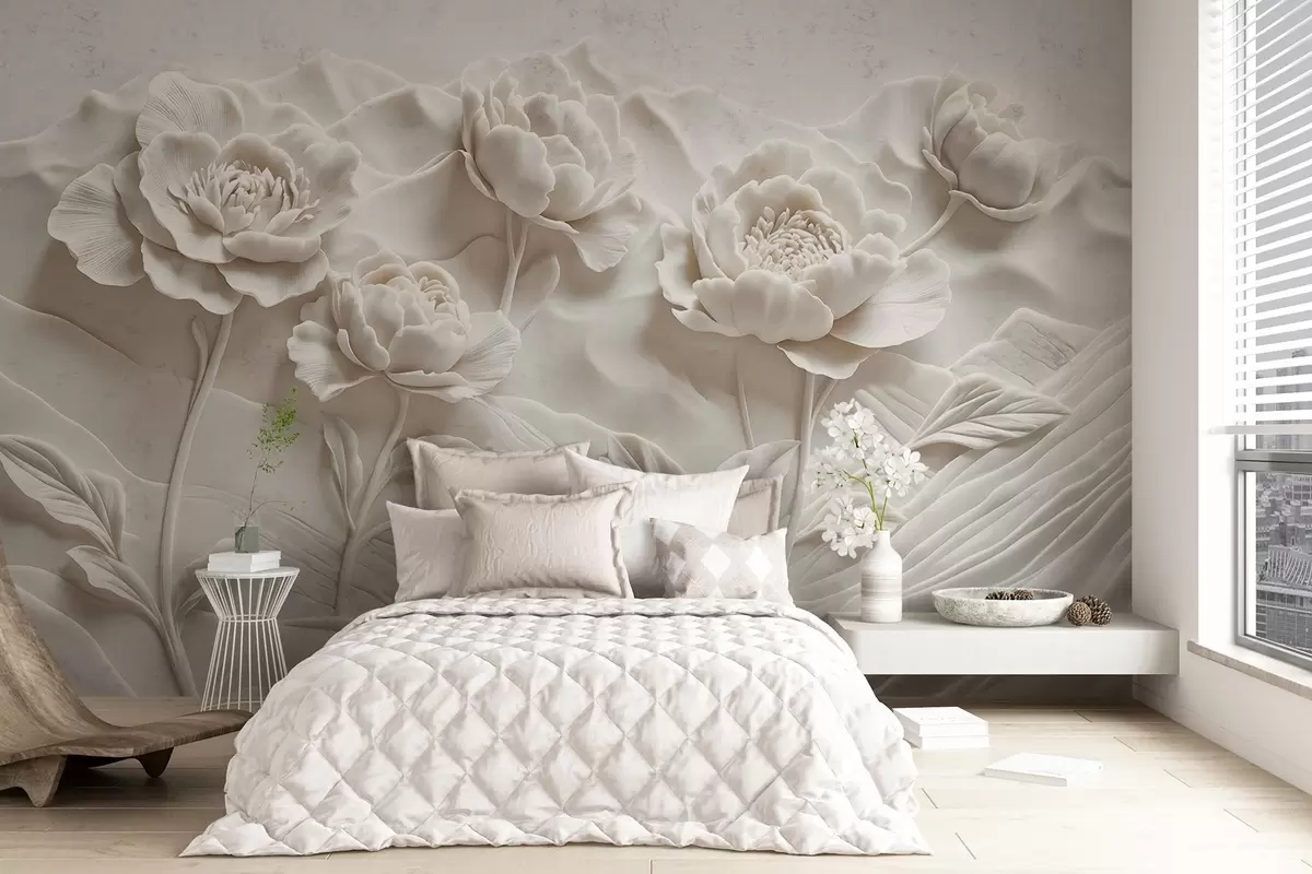 Fototapety Biela kvetinová imitácia reliéfnej plastiky s veľkými detailnými kvetmi pivónie na hladkom pozadí Nr. w08612