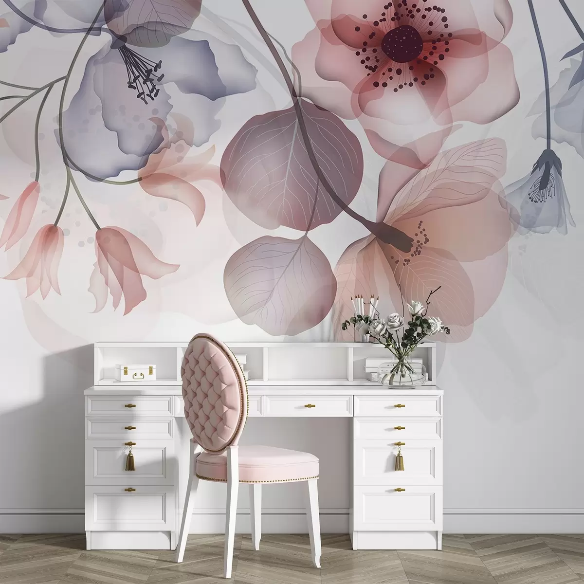 Fototapety Jemné ružové a sivé priesvitné kvety s jemnými okvetnými lístkami a tmavými stredmi na svetlom pozadí Nr. w08613