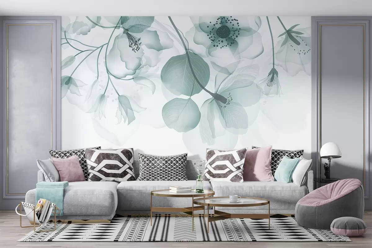 Fototapety Jemné tlmené tyrkysové priesvitné kvety s jemnými okvetnými lístkami a tmavými stredmi na svetlom pozadí Nr. w08613v1