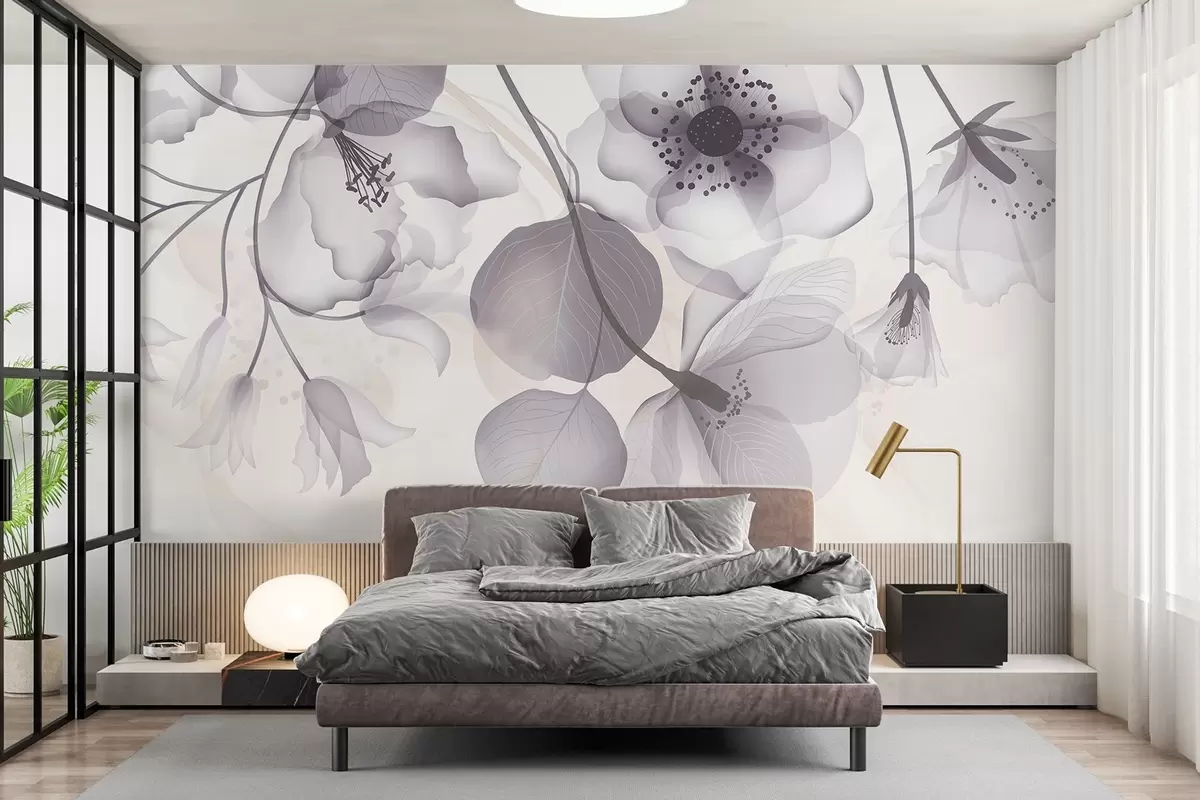 Fototapety Jemné sivé a béžové priesvitné kvety s jemnými okvetnými lístkami a tmavými stredmi na svetlom pozadí Nr. w08613v2