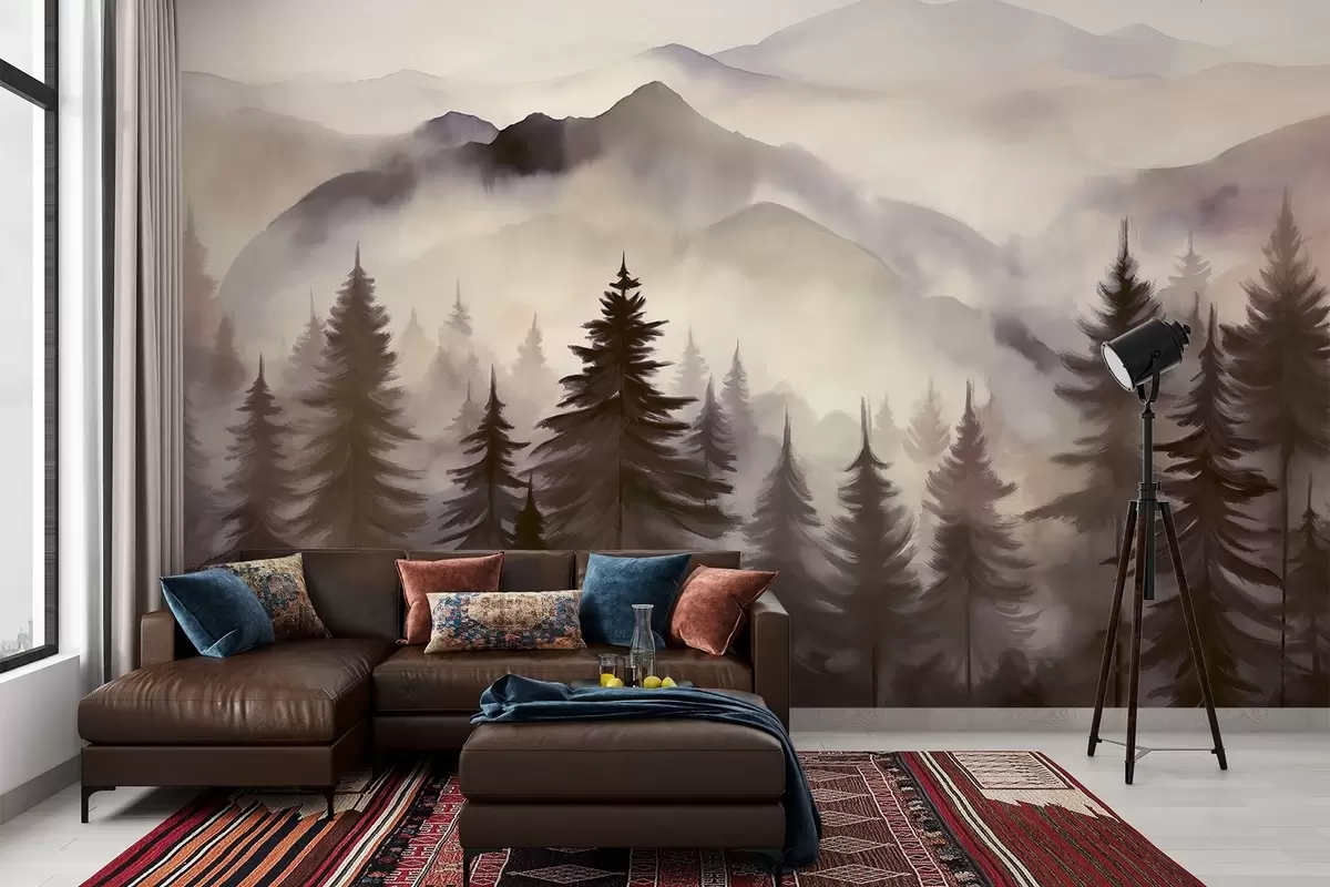 Fototapety Horská krajina s lesom borovíc a vrstevnatými horami počas svitania s ľahkou hmlou akvarel imitácia umenia Nr. w08639v1