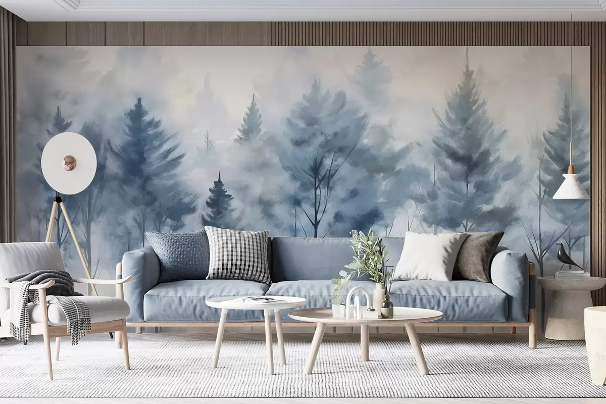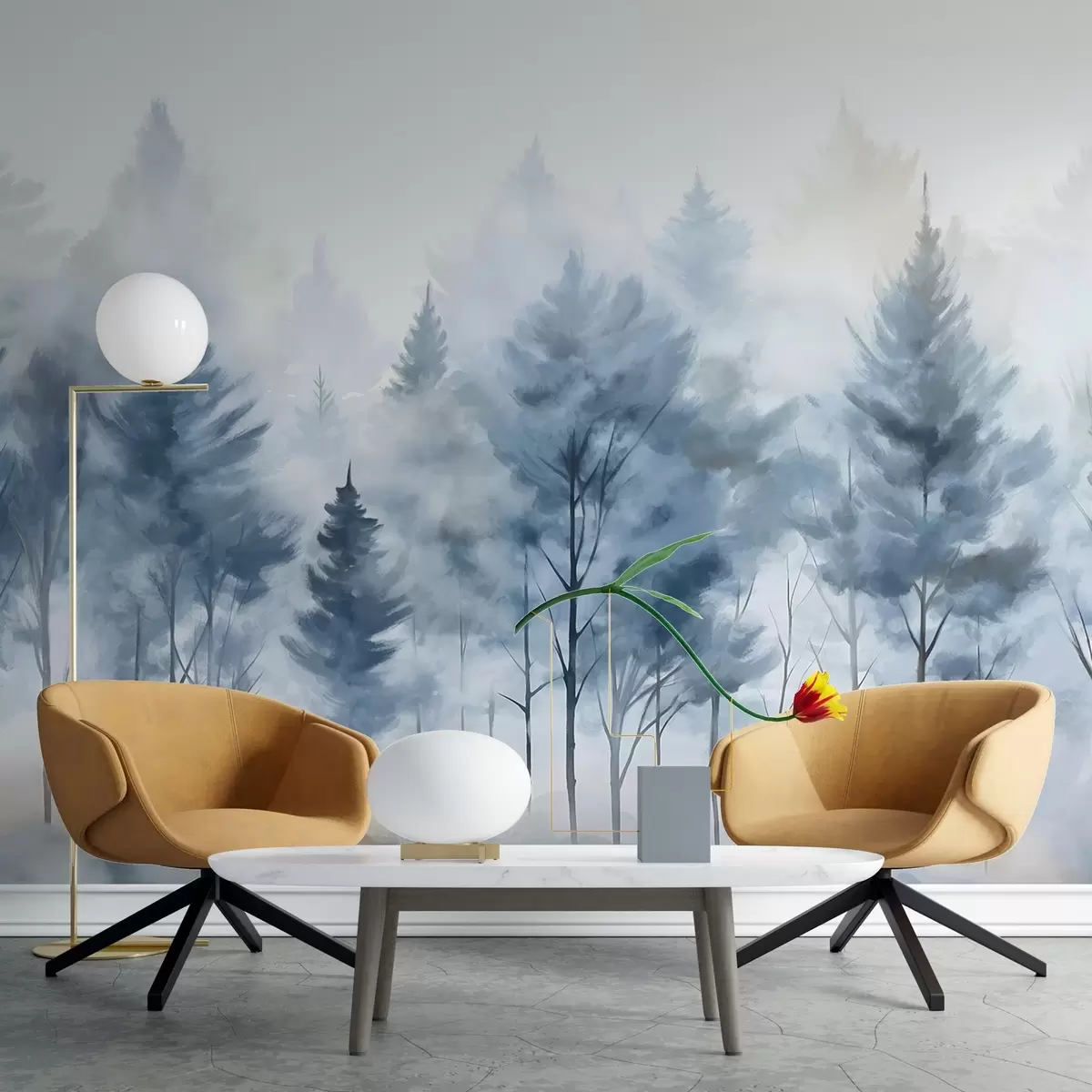Fototapety Hmlistá lesná krajina s vysokými borovicami a holými listnatými stromami v popredí akvarelová imitácia umenia Nr. w08643