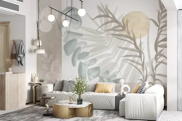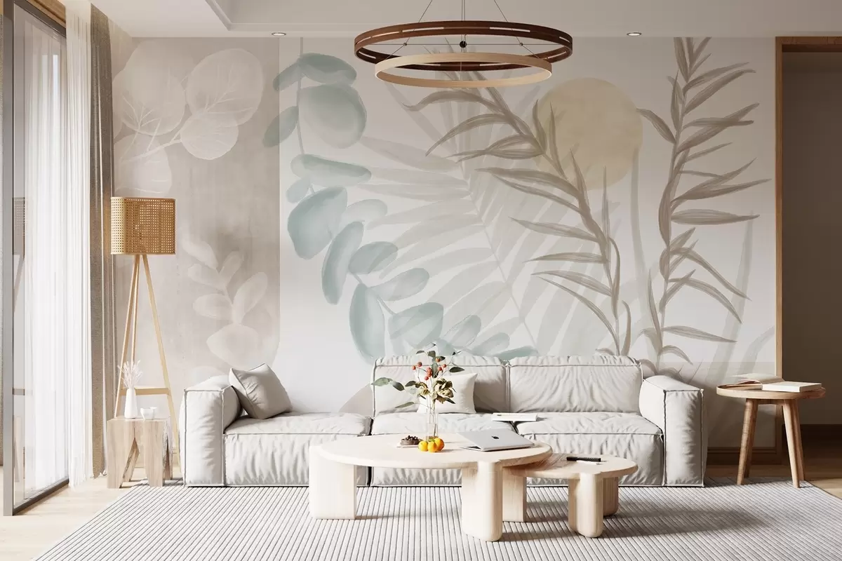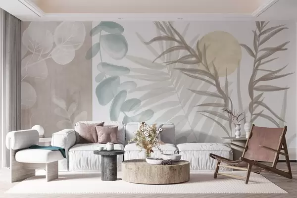 Fototapety Minimalistická abstraktná potlač so štylizovanými listami a eukaliptom s jemnými, béžovými organickými tvarmi v tlmených pastelových farbách Nr. w08648