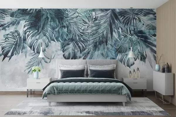 Fototapety Tropické listy v odtieňoch teal a zelenej farby, kaskádovito padajúce zhora, na svetlom, štruktúrovanom pozadí Nr. w08667
