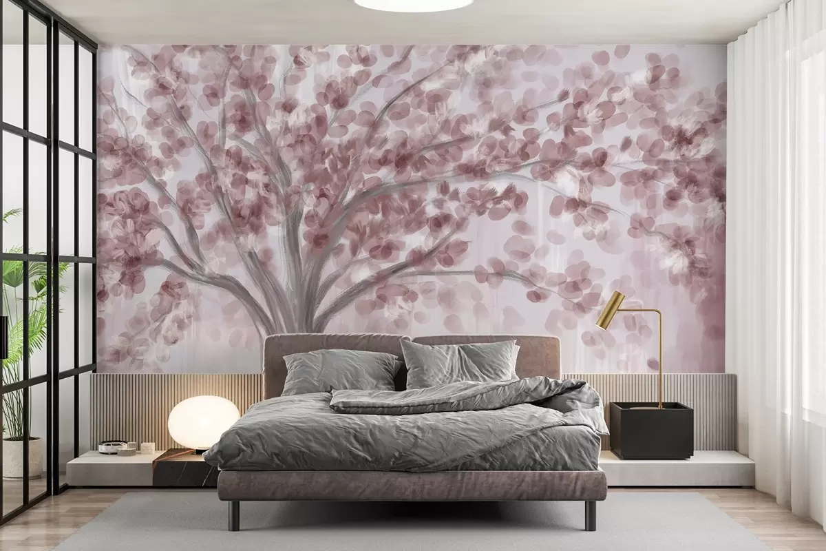 Fototapety Veľký strom s jemnými, abstraktnými listami v ružovej farbe na svetlom, neutrálnom pozadí, ktoré zvýrazňuje tóny stromu Nr. w08669v2
