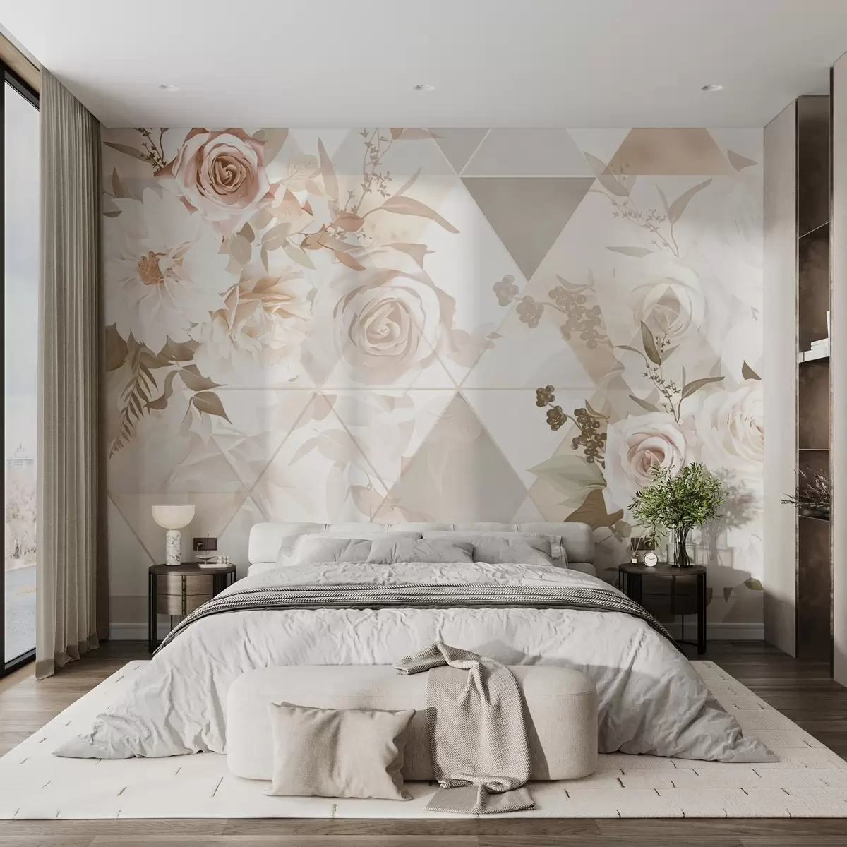 Fototapety Kytice ruží a pivoniek na vzorovanom pozadí v svetlých béžových tónoch Nr. w08679