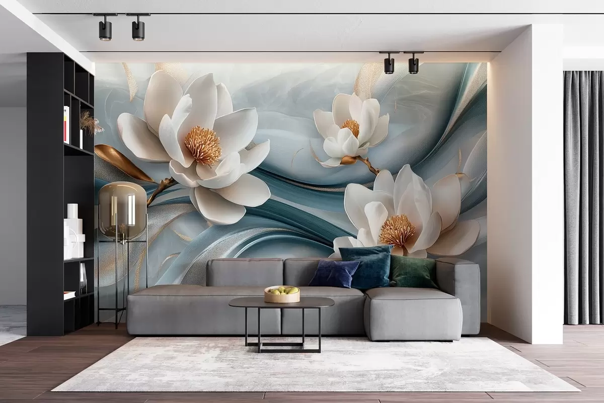 Fototapety Kvety magnólie v kombinácii s modrými, bielymi a žltými tónmi s abstraktnými vlnami Nr. w08695