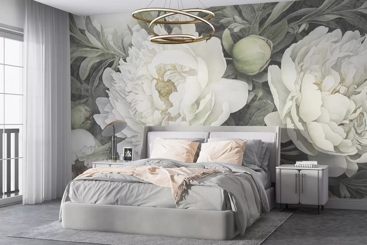 Fototapety Textúrované pastelové biele pivonky s jemnými zelenými púčikmi a lístkami s jemnými okvetnými lístkami Nr. w08697