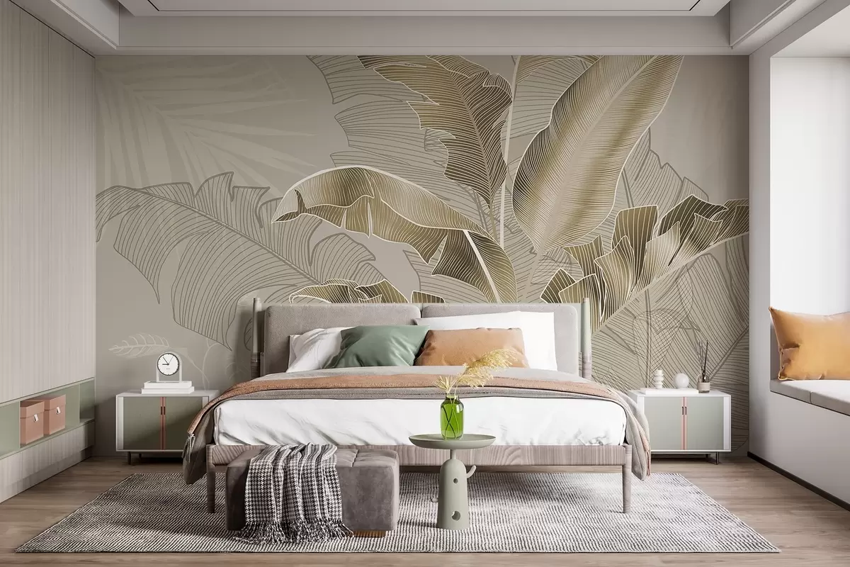 Fototapety Harmonická kompozícia tropických listov v béžových a hnedých odtieňoch s detailnou líniovou prácou Nr. w08698