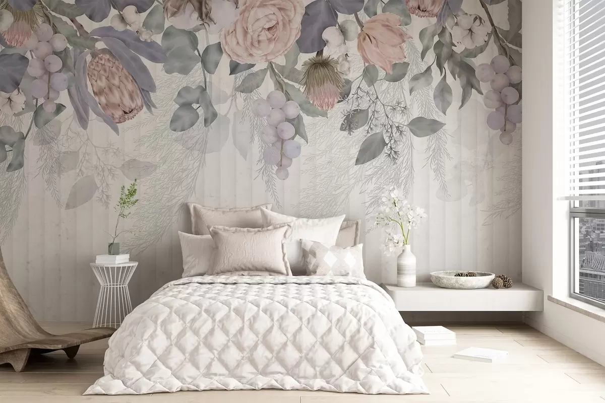 Fototapety Kvetinové pastelové ružové ruže, kvety protey, vetvičky eukalyptu a bobule na textúrovanom pozadí Nr. w08700