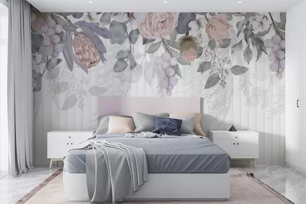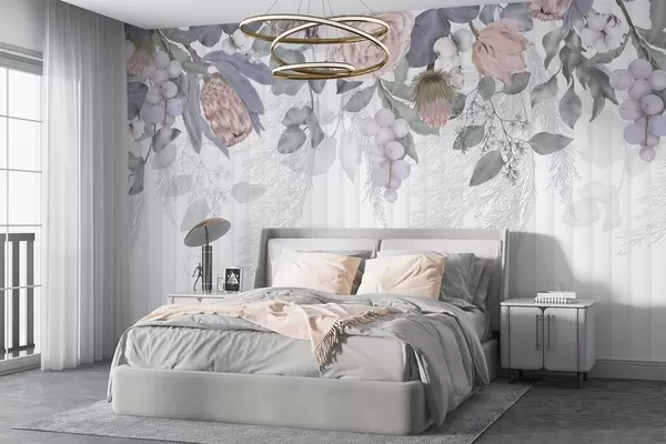 Fototapety Kvetinové pastelové ružové ruže, kvety protey, vetvičky eukalyptu a bobule na textúrovanom pozadí Nr. w08700