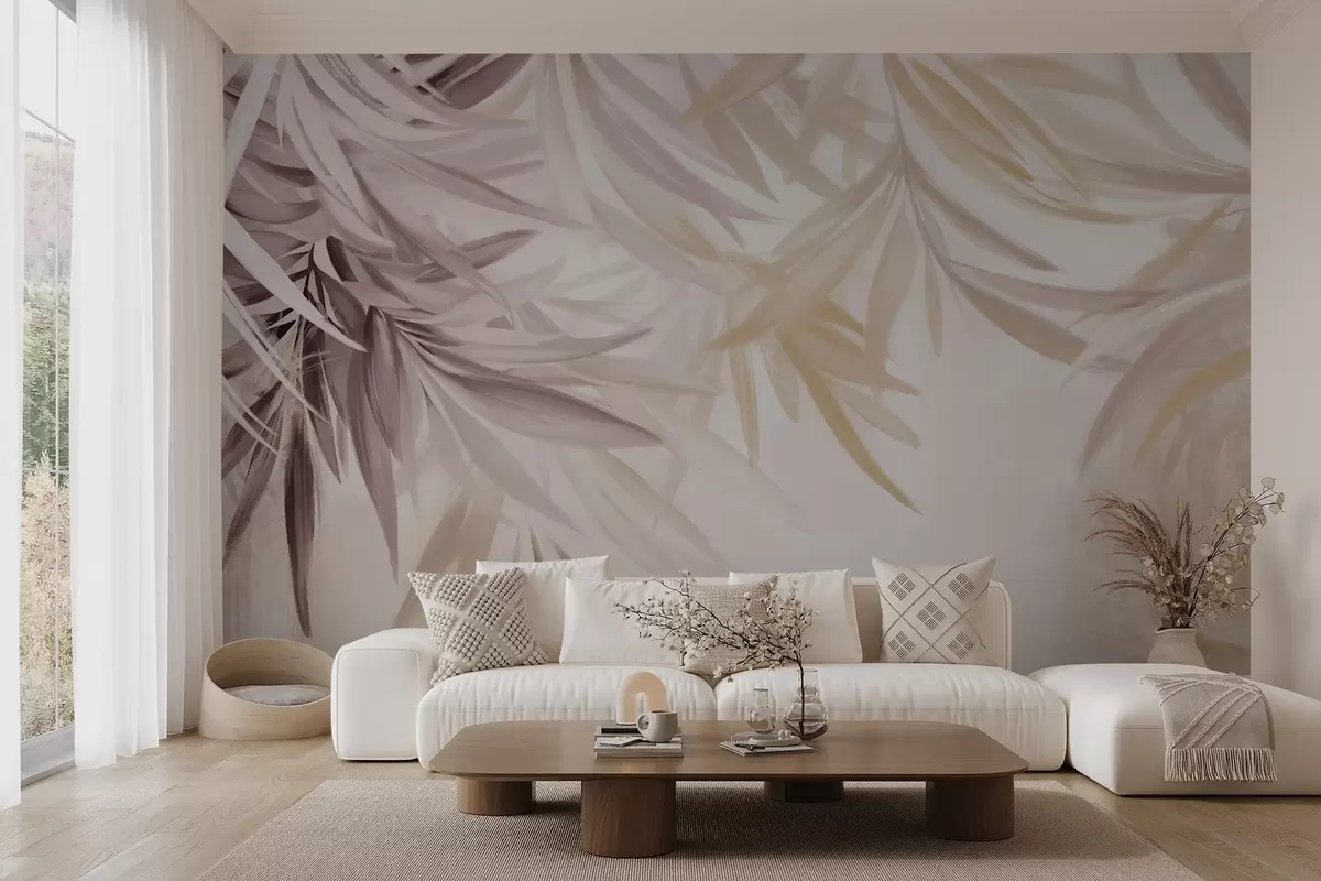 Fototapety Mäkké, splývavé svetlé tropické listy v odtieňoch hnedej a oranžovej farby, ktoré sa prelínajú do bledej, neutrálnej potlače Nr. w08703v1