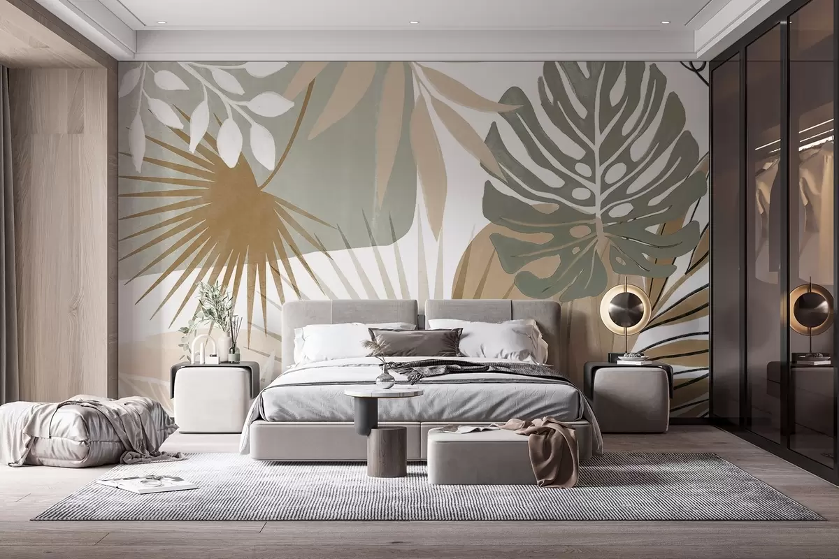 Fototapety Abstraktný dizajn s rôznymi tropickými listami v zemitých tónoch zelenej, béžovej a krémovej farby Nr. w08738v1