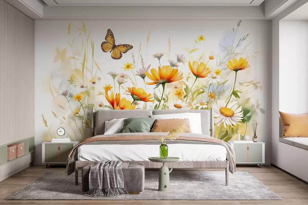 Fototapety Živé akvarelové pole kvetov s oranžovými a žltými kvetmi a motýľom nad kvetmi Nr. w08739