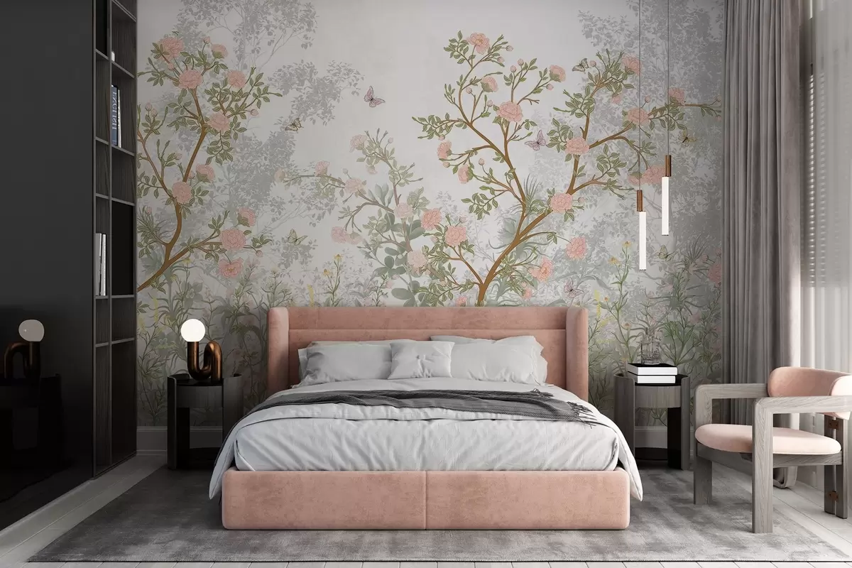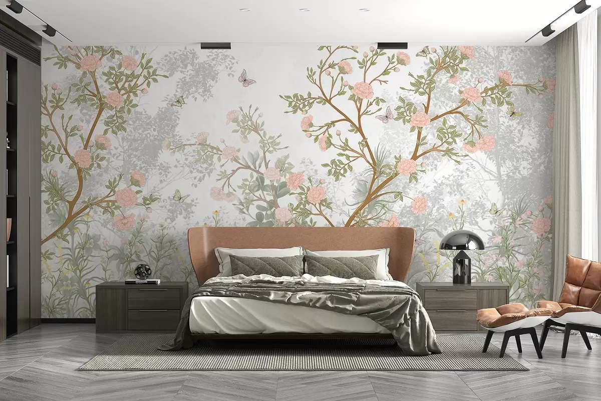 Fototapety Jemne ružovo kvitnúce stromy, lietajúce motýle a zelené listy prepletené štíhlymi konármi Nr. w08744