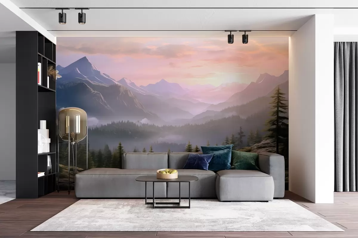 Fototapety Pokojná horská krajina na úsvite s jemnou hmlou na pozadí lesa Nr. w08750