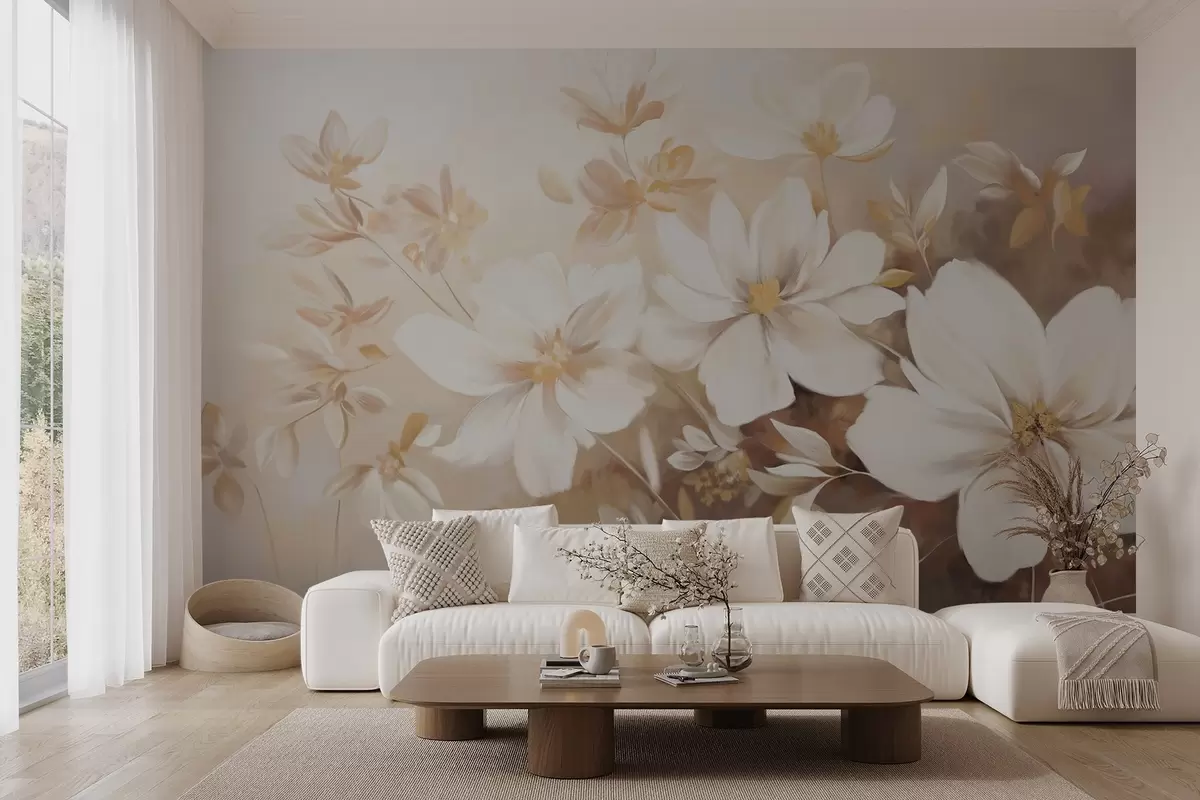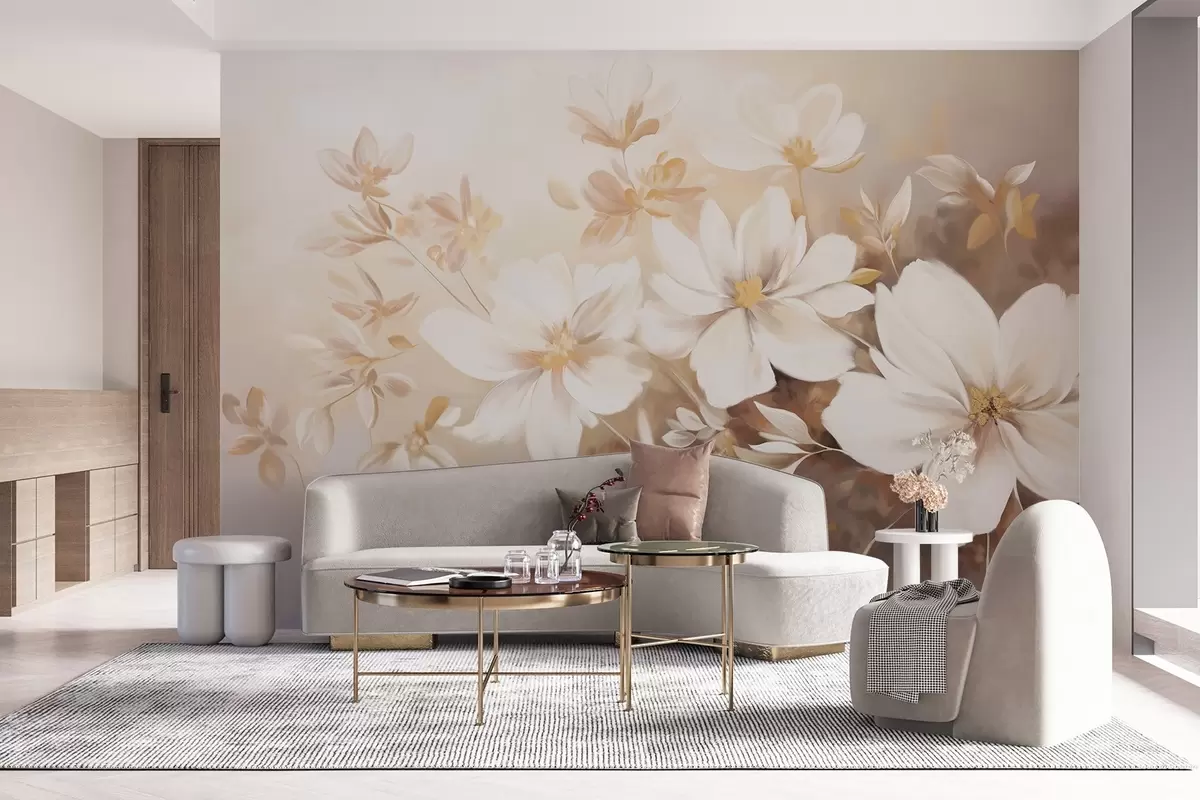 Fototapety Biele maľované kvety s jemnými okvetnými lístkami a jemnými listami na svetlom béžovom a krémovom pozadí Nr. w08780