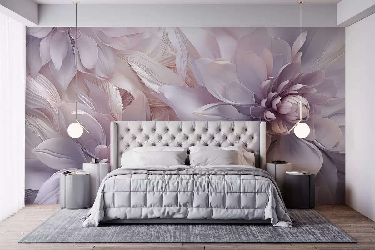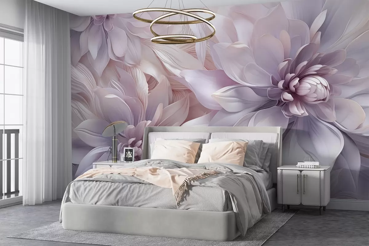 Fototapety Jemné, vrstvené kvety v odtieňoch bledoružovej, levanduľovej a bielej s jemnými okvetnými lístkami a zložitými detailmi Nr. w08783