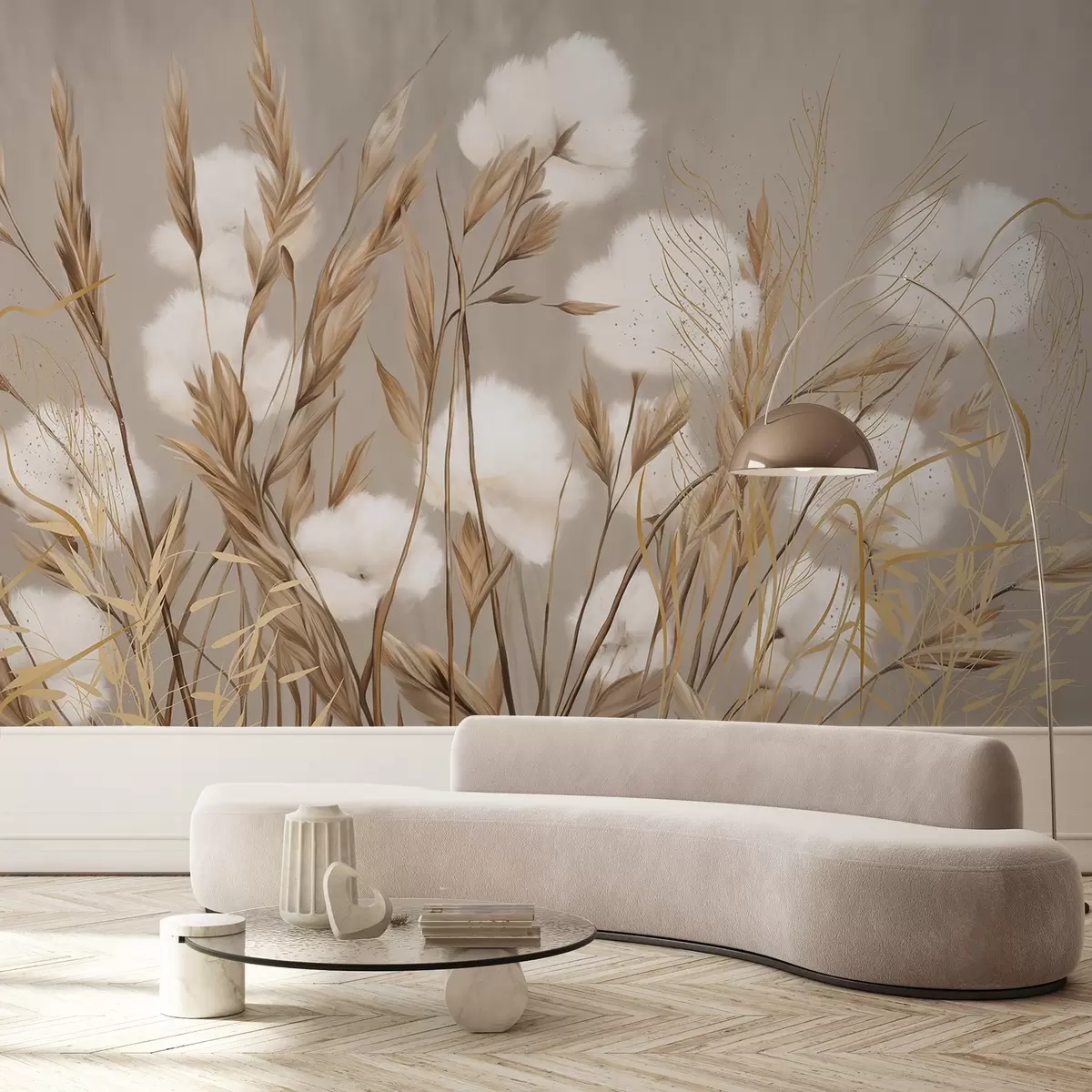 Fototapety Mäkké, nadýchané bavlnené biele kvety a vysoké oranžové trávy na béžovom pozadí s tlmenou textúrou Nr. w08784