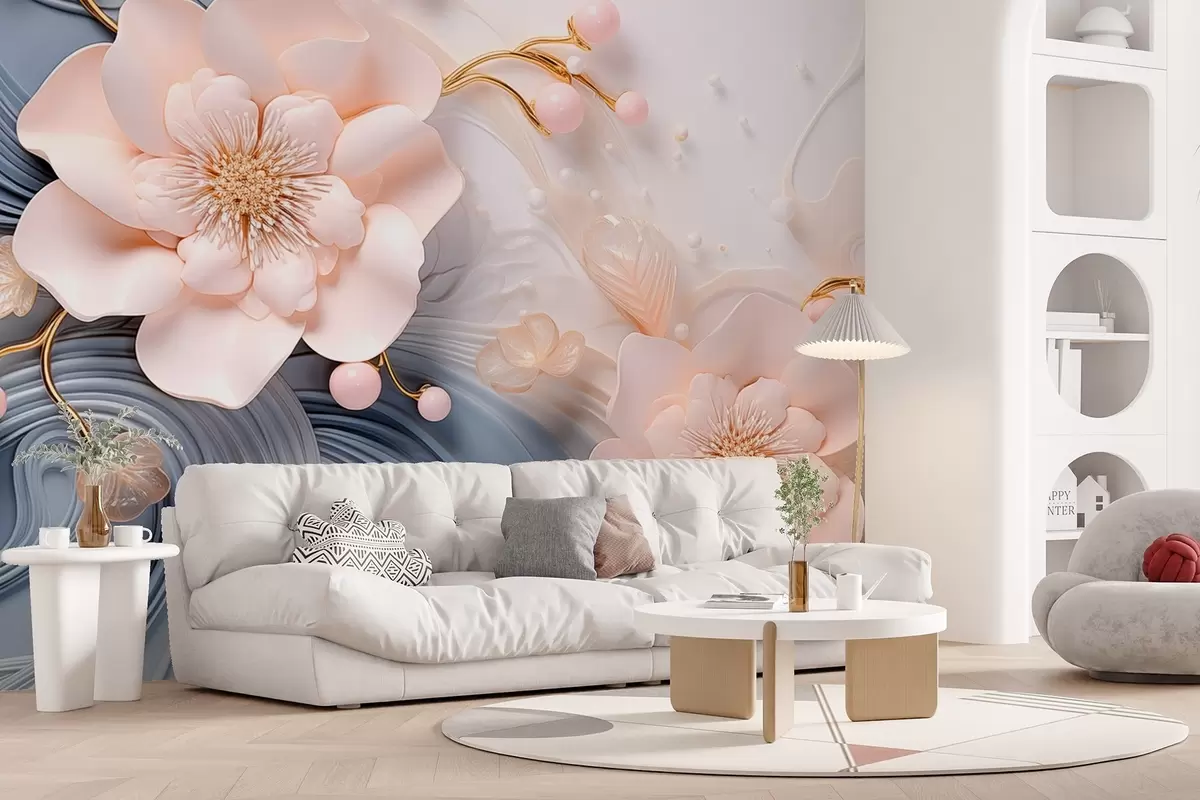Fototapety 3D dizajn pozadia s ružovými kvetmi a perlami na pozadí modrých a bielych vĺn Nr. w08806