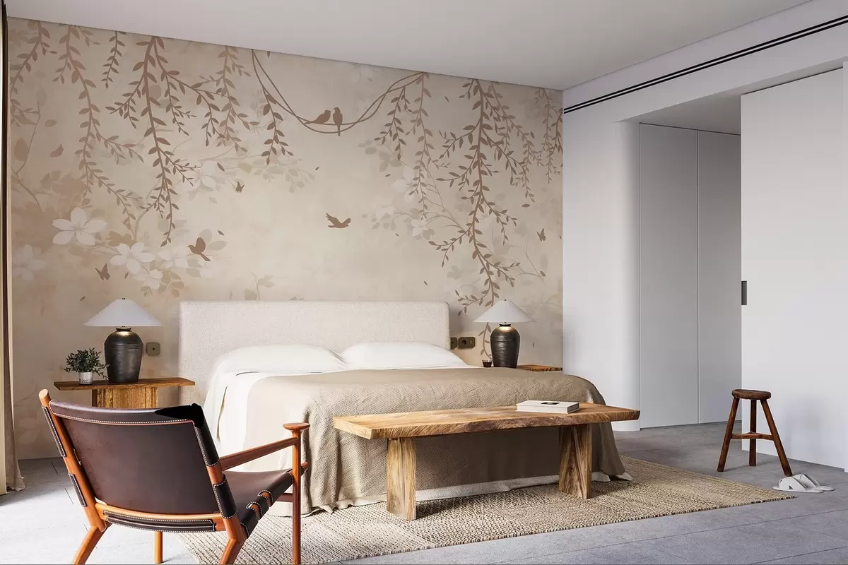 Fototapety Vtáky so závesnými rastlinami a kvetinovým vzorom v svetlých béžovo-krémových tónoch Nr. w08809