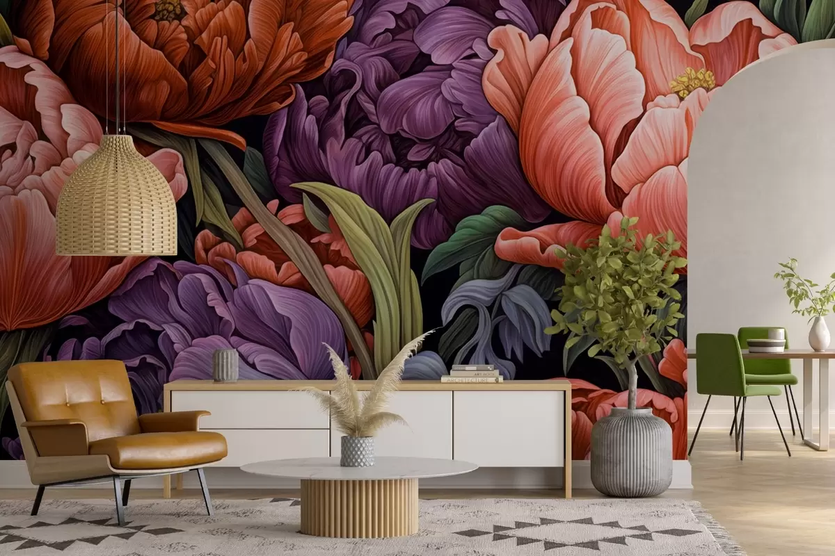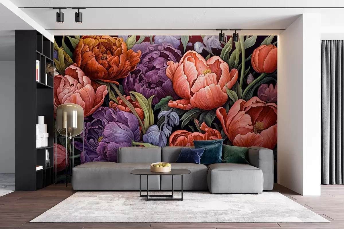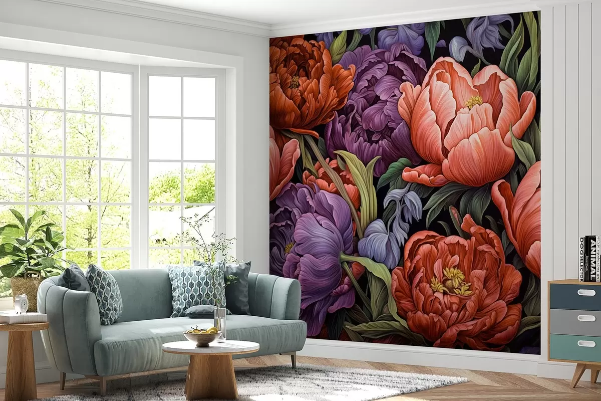 Fototapety Tulipány a pivonky vo viktoriánskom štýle, v červenej a fialovej farbe Nr. w08818v1