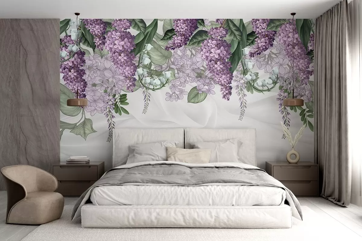 Fototapety Pastelové lila kvety a zelené listy na bielom pozadí s imitáciou hodvábnej tkaniny Nr. w08825