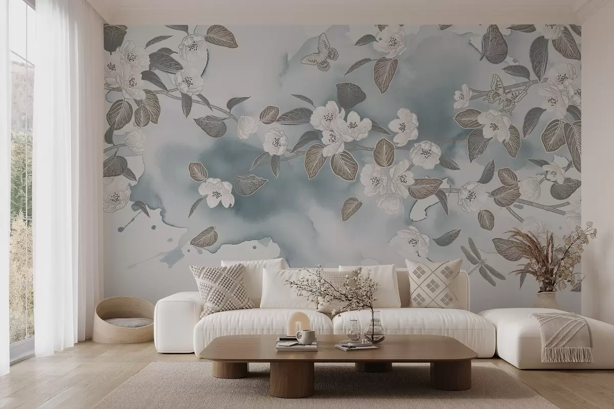 Fototapety Vetva čerešňového kvetu s kvetmi, listami, motýľmi na svetlomodrom akvarelovom pozadí s textúrou Nr. w08831v1