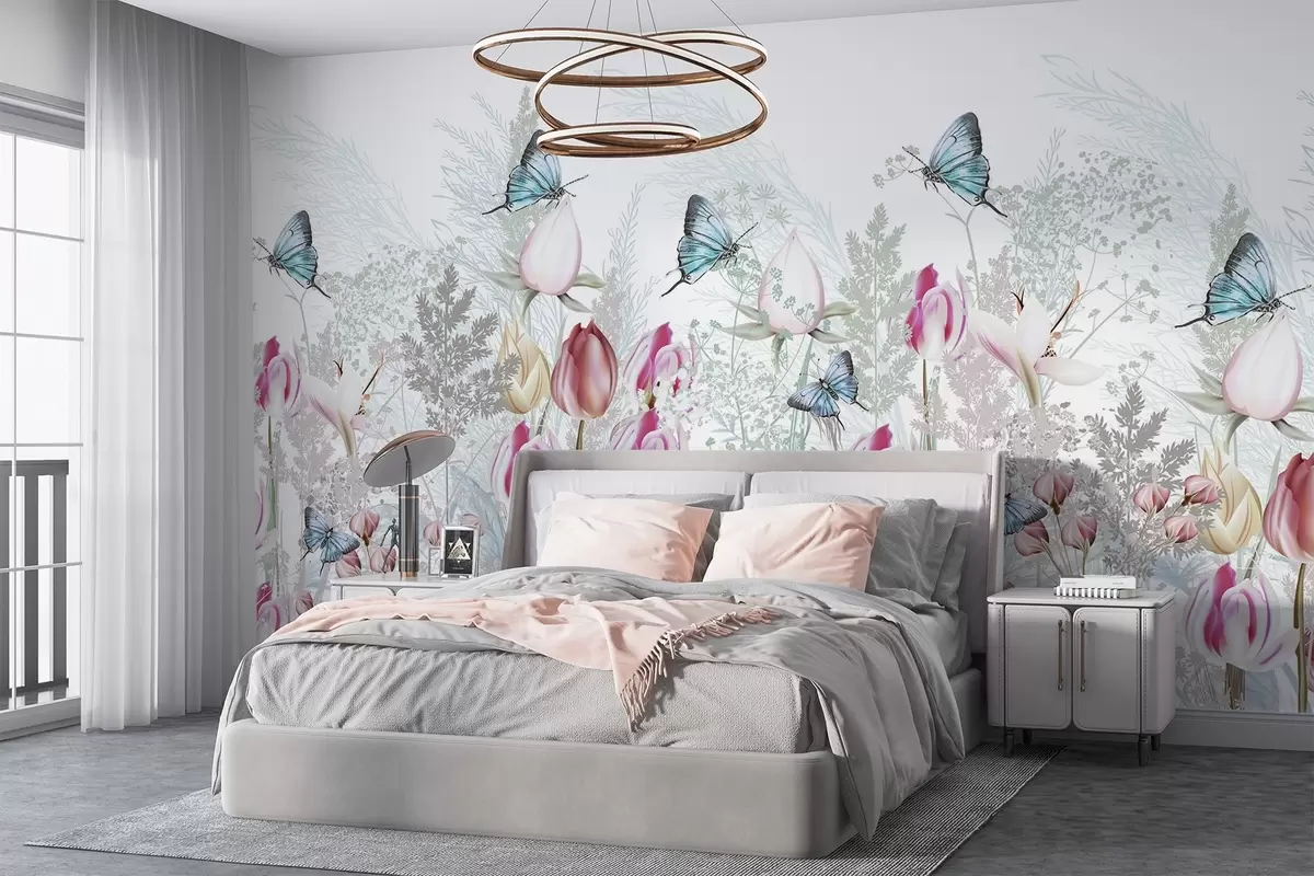 Fototapety Pastelová potlač s kvetmi tulipánov, trávou a lietajúcimi motýľmi v záhrade Nr. w08834