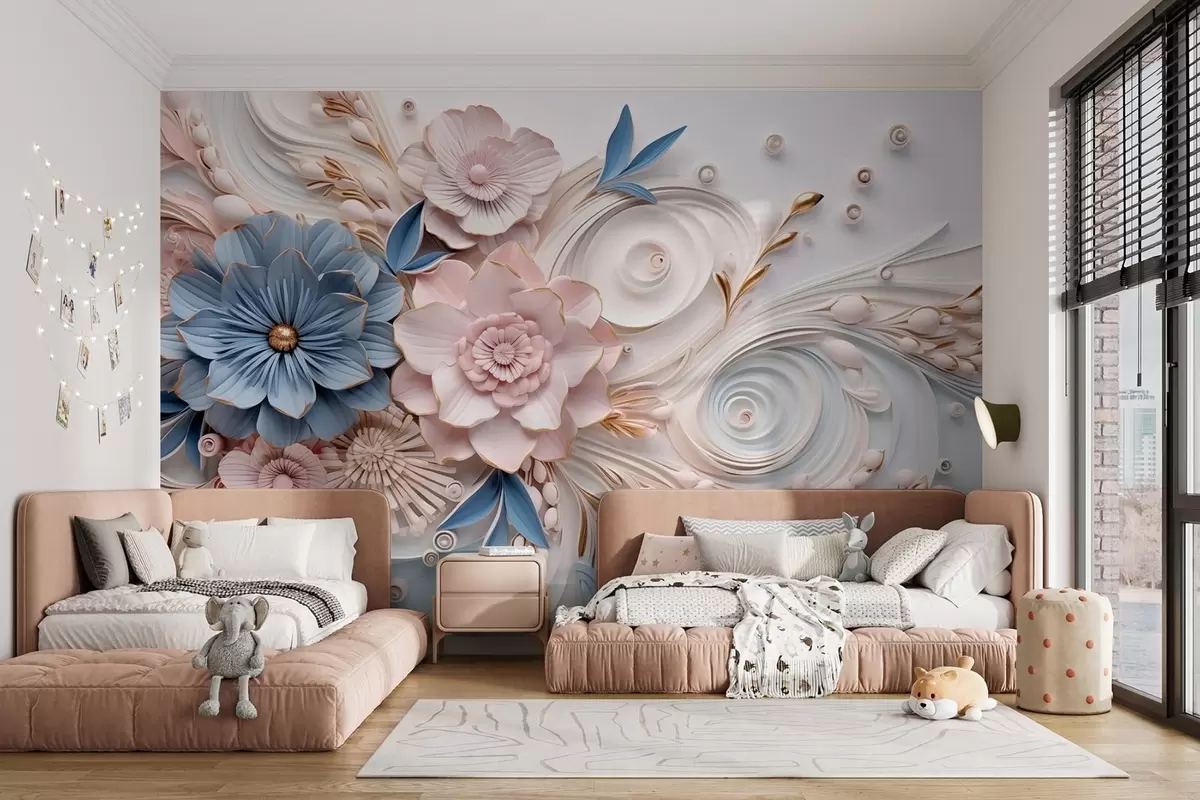 Fototapety Jemná kvetinová kompozícia v ružových a modrých tónoch s jemným reliéfnym pozadím Nr. w08847