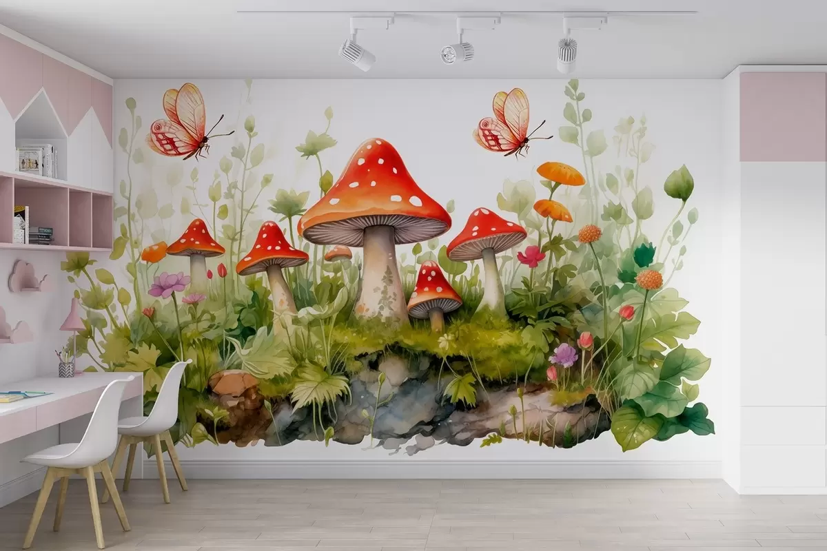 Fototapety Lesná krajina na bielom pozadí v akvarelovom štýle s hubami, žabami a motýľmi Nr. w08854