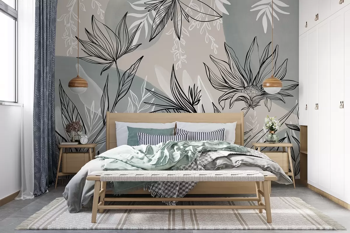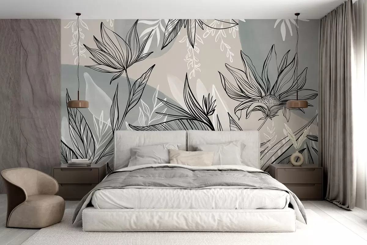 Fototapety Kvetinové línie s veľkými listami a kvetmi na pozadí béžovej a modrej akvarelovej farby Nr. w08865