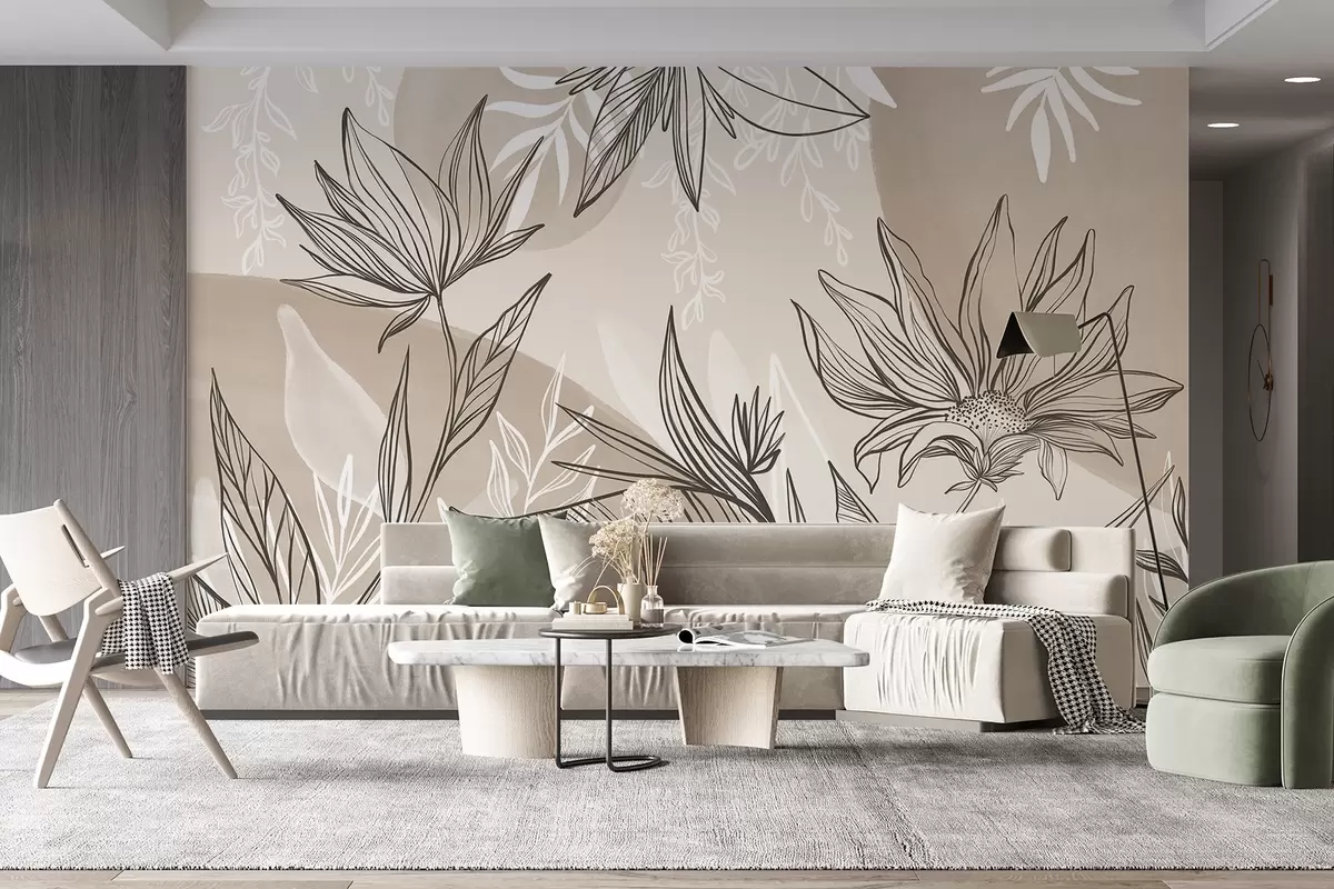 Fototapety Kvetinové línie s veľkými listami a kvetmi na pozadí béžového akvarelu Nr. w08865v1