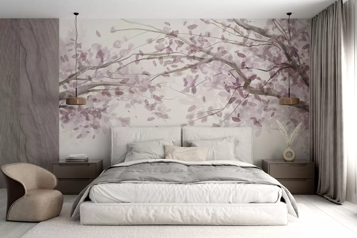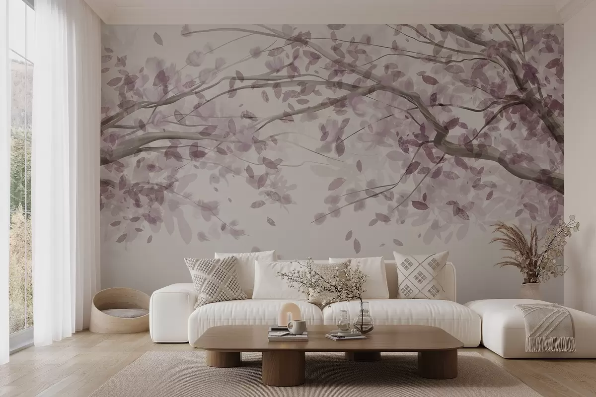 Fototapety Rozkvitnuté vetvy s ružovými listami, jemné farby, jemné detaily, akvarelový štýl, na svetlom pozadí Nr. w08867