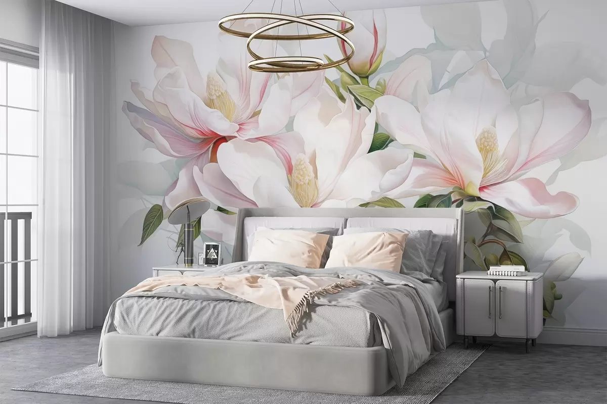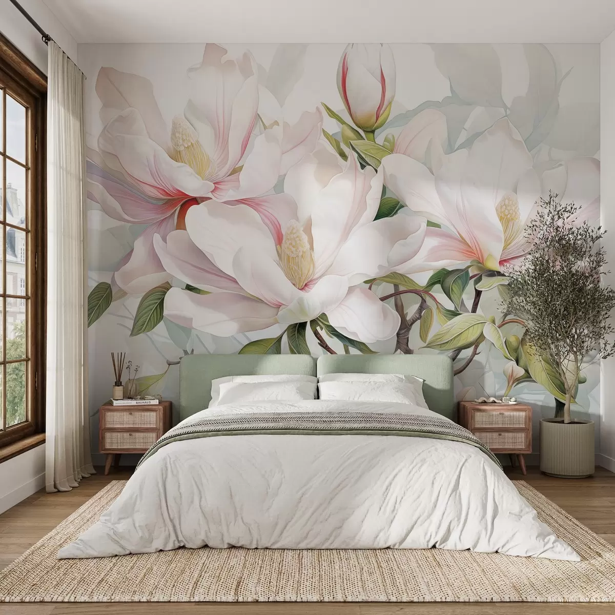 Fototapety Kvety magnólie s bielymi a ružovými okvetnými lístkami, listy a hnedé vetvy, mäkký a jemný akvarelový štýl Nr. w08885