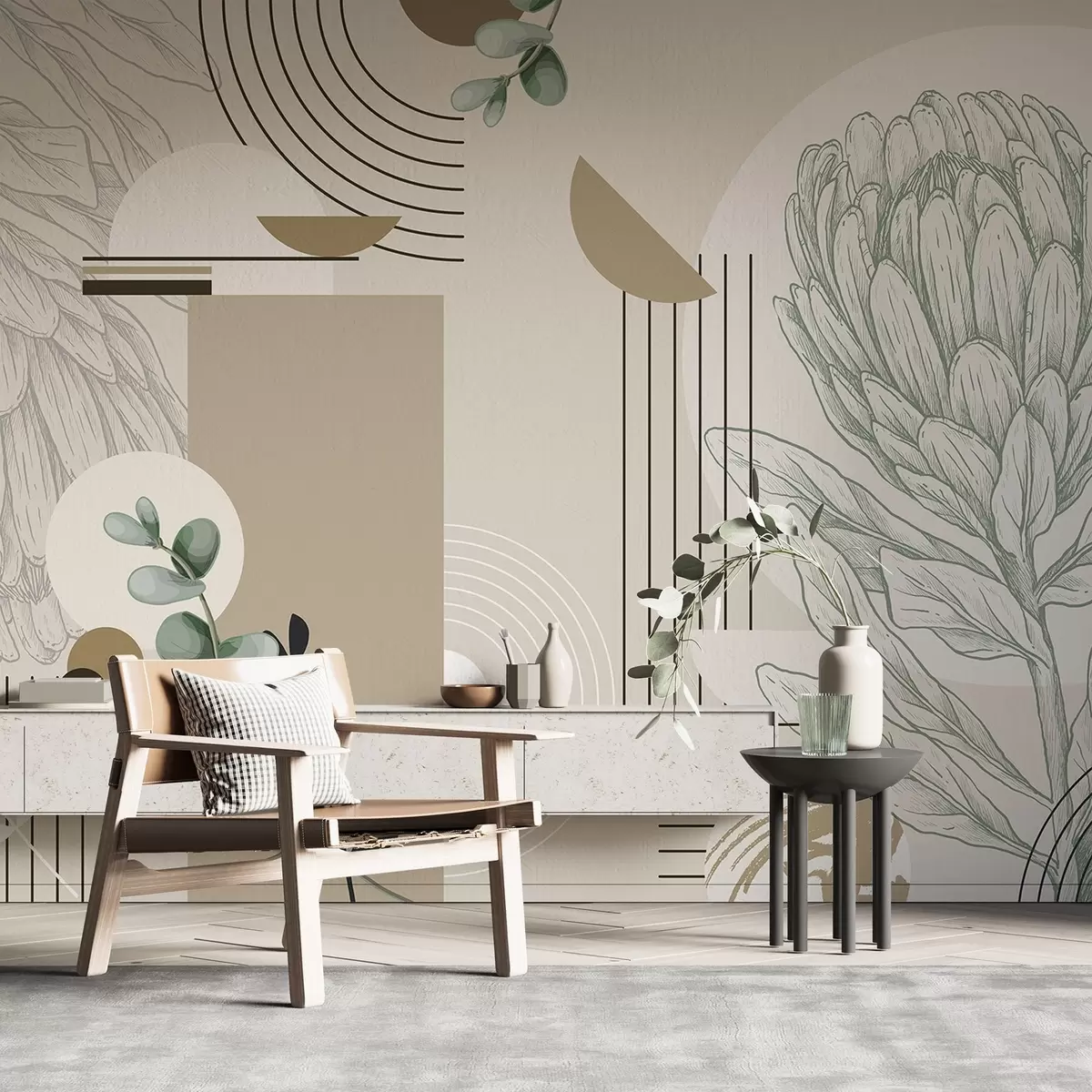 Fototapety Abstraktná botanická potlač s kvetom protey, eukalyptovými listami, geometrickými tvarmi v minimalistickom štýle, pastelové farby Nr. w08914